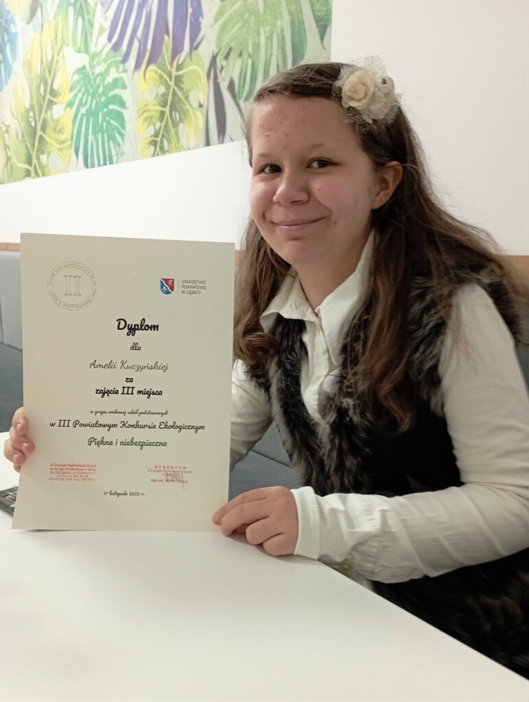 W konkursie wzięło udział 151 uczniów z całego powiatu. Z wielką radością informujemy, że wśród laureatów Powiatowego Konkursu Ekologicznego ” Piękne i niebezpieczne” III miejsce w kategorii szkół podstawowych zdobyła uczennica naszej szkoły Amelia Kuczyńska.